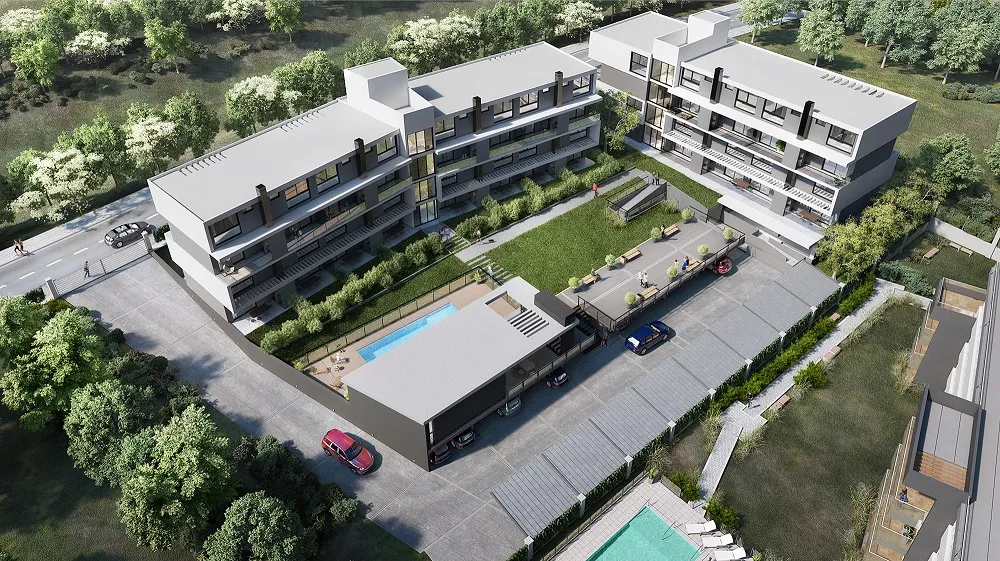 Departamento de un dormitorio en un condominio cerrado con amenities y rodeado de espacios verdes.